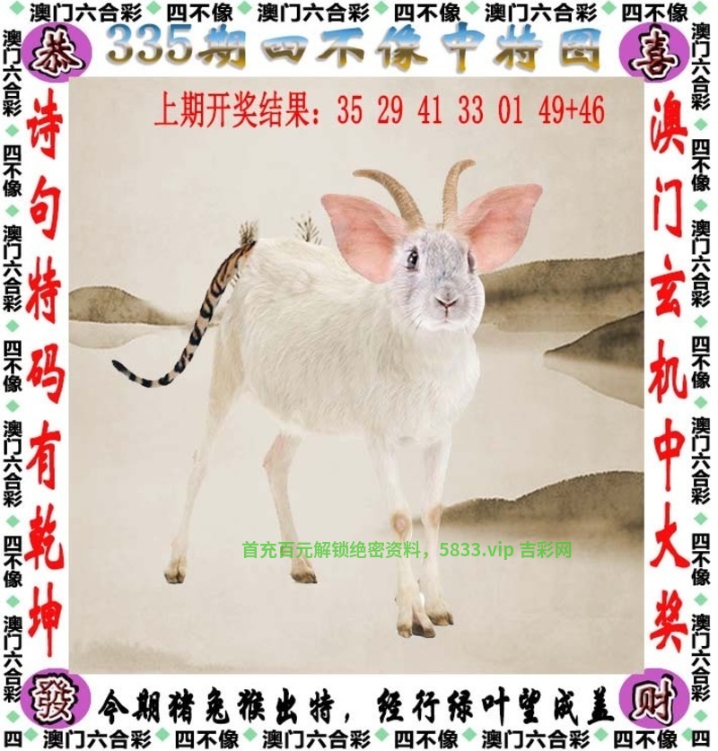 | 335期:今期猪兔猴出特,经行绿叶望成盖开:狗44准 ②合双+小数 |